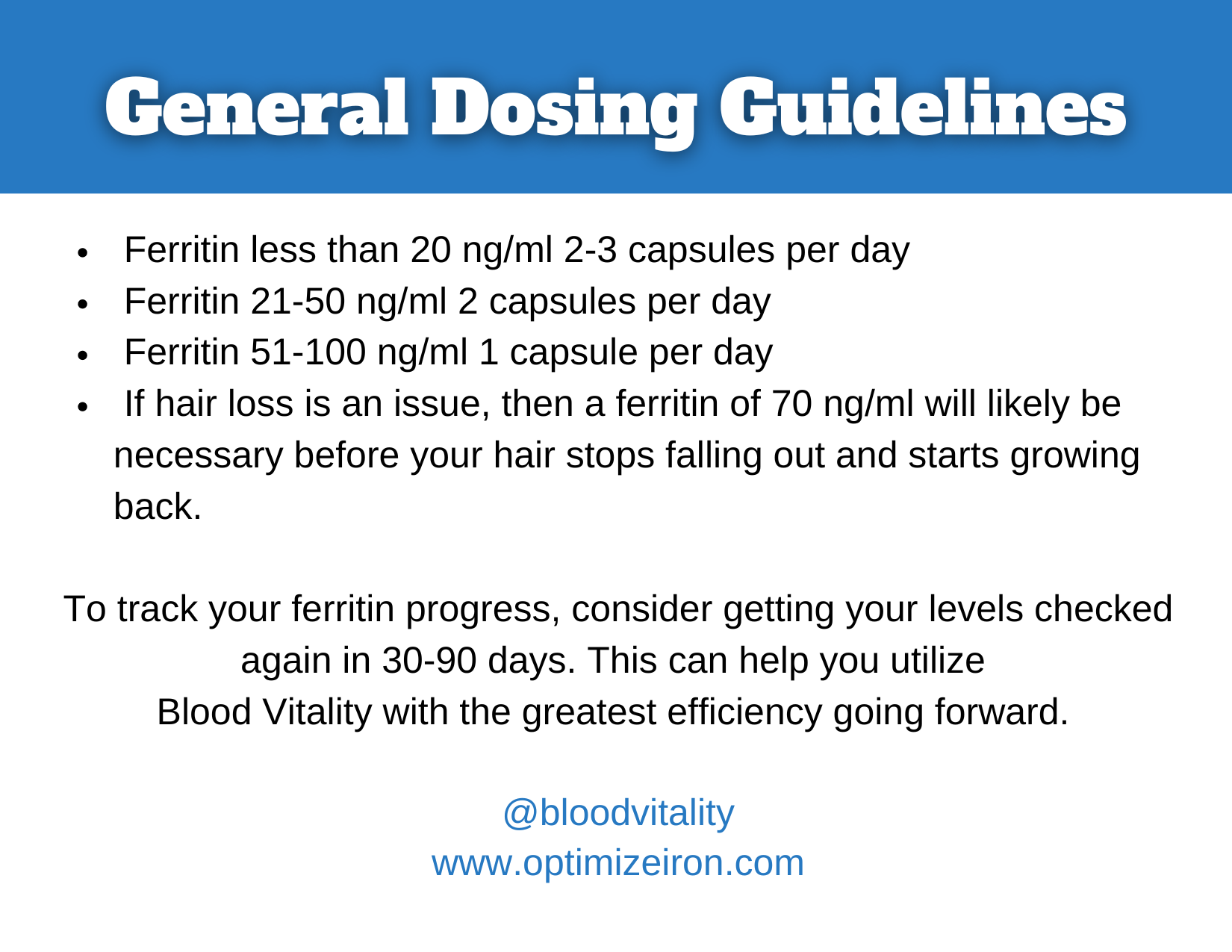 To track your ferritin progress, consider getting your levels checked again in 30-90 days. This can help you utilize Blood Vitality with the greatest efficiency going forward.
